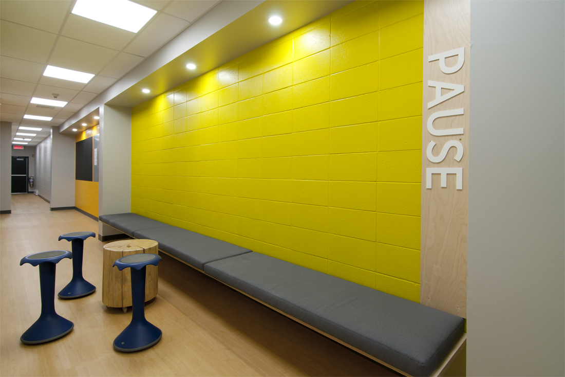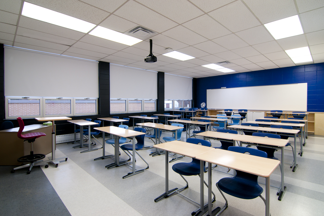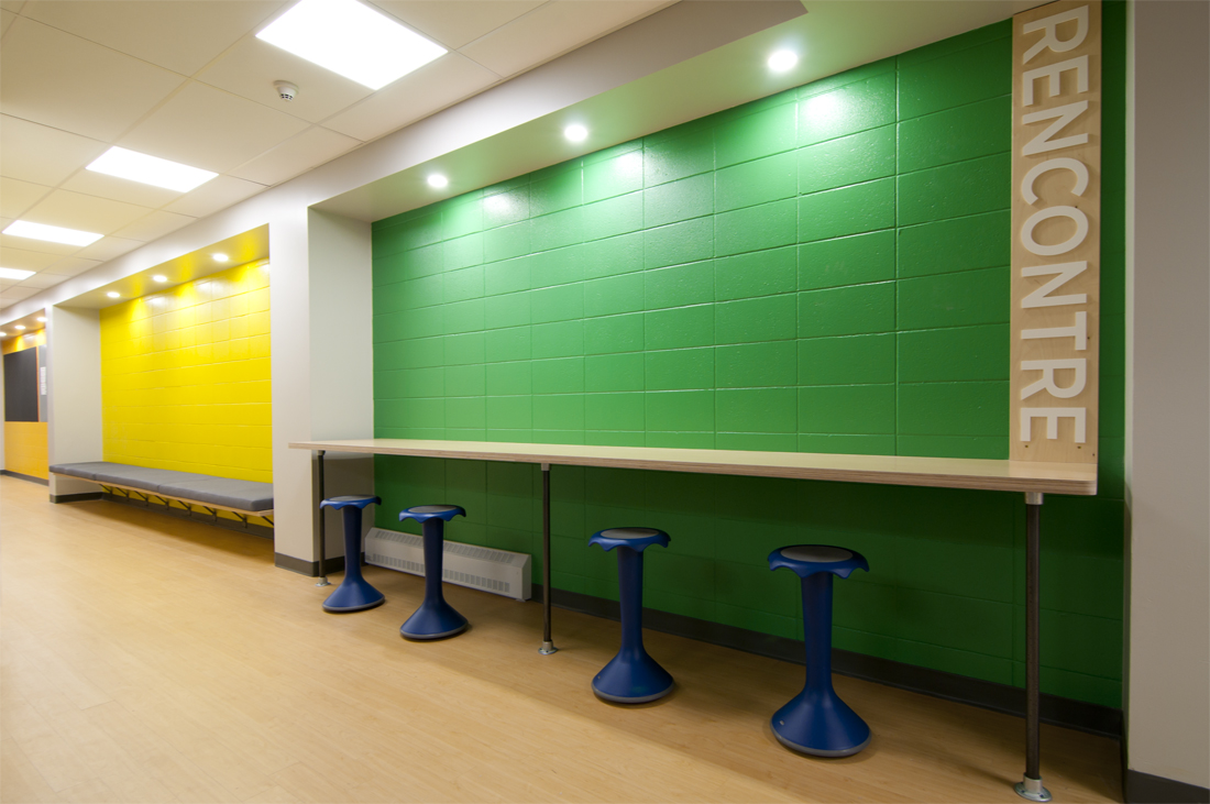 An uplifting learning space featuring the perfect balance of natural materials and vibrant colours. A somewhat traditional furniture layout is outfitted with durable desks and dynamic chairs that activate both the body and mind, stimulate the spine and stabilize posture.